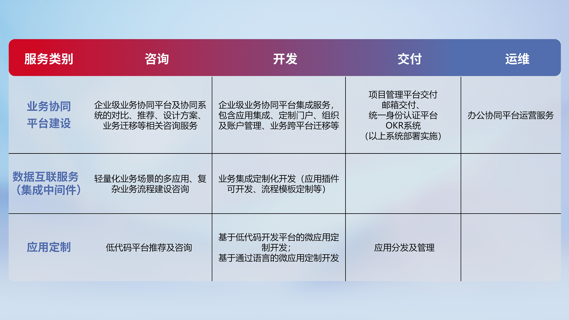 针对钉钉、、企微、、IDaas等平台级产品提供产品的规划、、、方案、、、、交付、、、定制化开发等服务,,,实现如统一协同办公、、、、智能客户服务、、混合会议管理、、智能数据查询、、等业务场景,,,,实现数字化转型。。。。